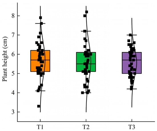 At the end of irrigation, the emergence of seedlings in each treatment plot was counted at 12:00 am every day, and the daily emergence rate of each treatment plot was recorded every day. The observation continued until 15 days after irrigation; see reference [17] for the correlation formula between the seedling emergence rate and seedling vigor index. After the cotyledon leaves of the cotton seedlings had unfolded, 15 cotton seedlings with consistent growth were selected from each treatment plot, and the heights of the seedlings were determined using a tape measure.