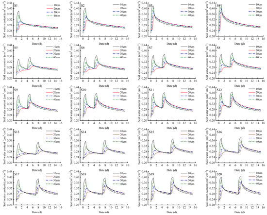 For the treatment with a 4-day irrigation interval (S5–S12), as the irrigation amount increased, the soil salt content of each soil layer gradually decreased. The peak value of the soil salt content after the second irrigation was slightly lower than that after the first irrigation. Before the second irrigation, the soil salt content in the 10–40 cm soil layer under the different treatments showed a trend of first decreasing, then increasing, and then decreasing again; the trend of soil salt content in the 20 cm soil layer was not significant. At 15 days, the average soil salt content of the S12 treatment was 3.000 g/kg lower than that of the S5 treatment.