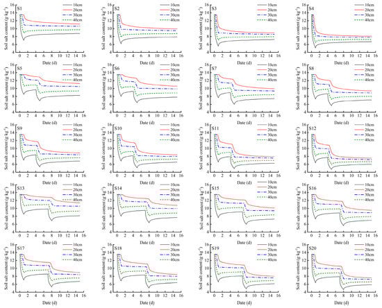 For the treatment with a 7-day irrigation interval (S13–S20), as the irrigation amount increased, the soil salt content of each soil layer gradually decreased. The peak value of the soil salt content after the second irrigation was slightly lower than that of the first irrigation, and the change in the soil salt content at the 20 cm soil layer was lower than the change in the soil salt content treated with a 4-day irrigation interval. At 15 days, the average soil salt content of the S20 treatment was 3.038 g/kg lower than that of the S13 treatment.