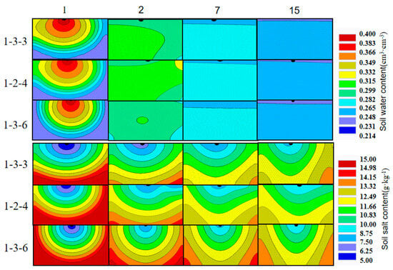 Water and salt changes under different planting patterns in S2 scenario. Note: The numbers on the left side of the image represent the cotton planting mode. For example, 1-3-3 represents one film, three tubes, and three rows. The number at the top of the image represents the number of days after stopping watering. For example, 1 represents the first day after stopping watering. The first to third lines of the image show changes in soil water content, while the fourth to sixth lines show changes in soil salt content.