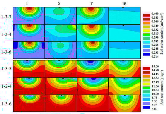 The results of the water–salt change rule simulated by the HYDRUS-2D scenario showed that, when the initial water content of the soil and the irrigation quota were certain, the average soil water content of the treatment with an irrigation frequency of twice was higher than that of the treatment with an irrigation frequency of once in the soil layer of 10–40 cm on the 15th day; the average soil water content of the treatment with an irrigation interval of 7 days was higher than that of the treatment with an irrigation interval of 4 days, which is because the irrigation frequency can change the spatial distribution of the soil water and soil water storage [31]. Under the condition of the same amount of irrigation, increasing the irrigation frequency can increase the water content of the upper soil layer, making the soil better maintain a moist state. Secondly, according to the study by Bai Xueer et al. [32], 24 h after the end of irrigation, the water content within the wetted body reached a relatively stable state. Therefore, compared to the treatment with a 4-day irrigation interval, the treatment with a 7-day irrigation interval can more effectively utilize the residual water in the soil during the two irrigation periods, which increases the average water content of the soil.