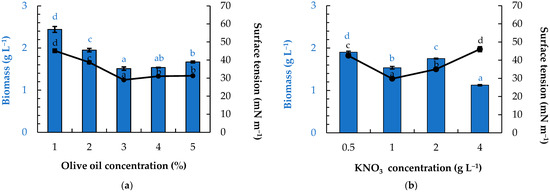 Bacterial growth (biomass) and surface tension of biosurfactant produced by P. marginalis C9. (a) BH media with different concentrations of olive oil (1–5%) and KNO3 at 1 g L–1, and (b) BH media with different concentrations of KNO3 (0.5–4 g L–1) and olive oil at 3%. The culture conditions were 28 ± 2 °C and 150 rpm for 120 h. The error bars represent the standard deviation (n = 3). The values with different letters indicate significant differences (p ≤ 0.05), according to Tukey’s test.