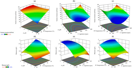 where Y represents the response (surface tension and biomass); A, B, and C are independent factors (A: X1 (pH), B: X2 (temperature), and C: X3 (agitation)); β1, β2, and β3 are linear regression coefficients; β11, β22, and β33 are quadratic coefficients; and β12, β13, and β23 are the cross-product coefficients of the model [44].