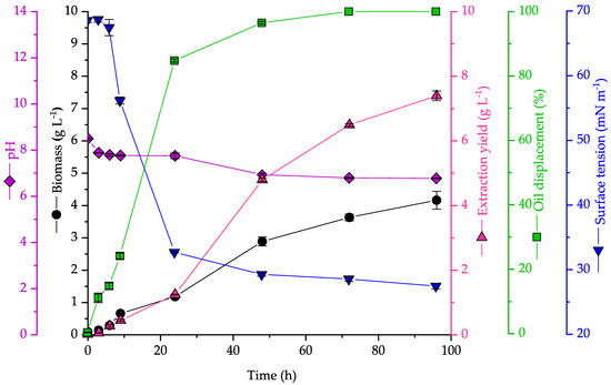 Based on optimization by RSM, the best culture condition was established, and the growth kinetics and biosurfactant production were described for P. marginalis C9 cultivated in BH medium supplemented with 3% olive oil and 1 g L−1 KNO3 at 25 °C for 96 h under an agitation speed of 200 rpm. The kinetic curve showed a relationship between biomass, extraction yield, and surface tension reduction, suggesting growth-associated biosurfactant production (Figure 4).