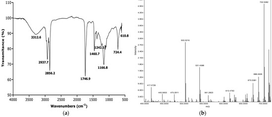 The FTIR (a) and LC-MS (b) spectra of the crude biosurfactant extract obtained from Pseudomonas marginalis C9.