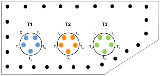Location of the three major field cages and their five internal tube cages at the experimental trial yard from the Plant, Animal, and Food Health Bureau, government of the San Juan province, Rivadavia district, San Juan province, Argentina. Specifications: large colorless circle = main experimental field cage; small blue, orange, and green circles = inner tube cages; small black circles = poplar tree windbreak. Treatments: T1 = infested peaches; T2 = infested oranges fruit; T3 = infested figs. Sub-treatments: TA = 20 released female parasitoids (RFP), TB = 40 RFP, TC = 80 RFP, TD = 160 RFP. Control tests: C1 = control test from T1; C2 = control from T2; C3 = control from T3.