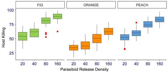 The medfly killing parasitoid capacity parameter did not vary significantly between the two study years (Estimate = 1.20, SE = 0.94, df = 709, Z = 1.27, p = 0.20). Therefore, the data from each testing year were pooled for analysis. The results for each tested host fruit species by parasitoid release density are shown in Figure 2. The parasitoid females killed between 54 and 88% of the host larvae in the fig, between 52 and 83% in the peach, and between 34 and 62% in the sweet orange. When all of the treatments were pooled, the host-killing parasitoid capacity of the tested fruit species was significantly higher in the fig (71% marginal mean), followed by the peach (67%), and the lowest in the sweet orange (46%) (Table S1). Overall, the host-killing parasitoid capacity became significantly higher as parasitoid release density increased, regardless of the tested fruit species. The marginal means of the host mortality percentage pooling of all of the fruit species were ~47, 53, 69, and 78 for treatments #1, #2, #3, and #4, respectively (Table S2).