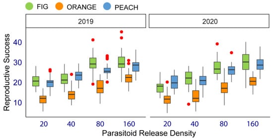 Percentage of offspring produced by Diachasmimorpha longicaudata (parasitoid reproductive success) when parasitizing medfly larvae infested three fruit host species (fig, sweet orange, and peach) at four parasitoid release densities (20, 40, 80, and 160 females) in studying years 2019 and 2020 under field cage conditions in Tulum fruit-growing valley, San Juan, central-western Argentina.