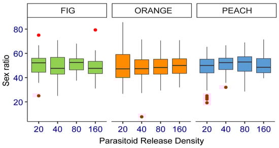 The parasitoid offspring sex ratio did not vary significantly between the two study years (Estimate = 0.28, SE = 0.80, Z = 0.35, p = 0.72). Therefore, the data from each testing year were pooled for analysis. The results of the emerged parasitoid females for each host fruit species by parasitoid release density are shown in Figure 4. Diachasmimorpha longicaudata exhibited around a 1:1 female–male sex ratio, as the percentage of females emerged from medfly puparia recovered from all three host fruit species ranged from 49 to 51%. There were no significant differences between the marginal means of parasitoid offspring sex ratio when both tested factors, host fruit species (Table S5), and parasitoid release densities (Table S6) were compared.