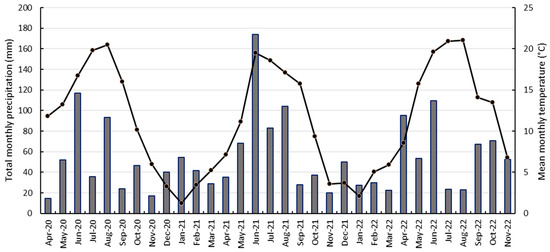 Average monthly temperature (dotted line) and precipitation (bars) during the growing period of winter wheat and ryegrass from April 2020 to November 2022. Data from DWD [27].