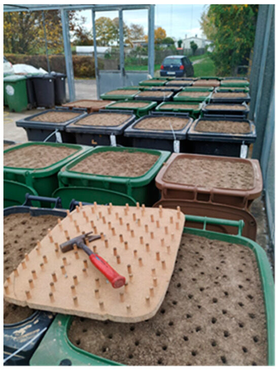 On 2 November 2020, winter wheat (Triticum aestivum L. cv. Apostel) was sown by hand using a self-made sowing stamp at a rate of 105 grains per container and a depth of 2.5 cm (Figure 3 and Figure 4A,B). The seeds were dressed in fungicides (“Landor CT” = fludioxonil, difenoconazol, tebuconazol). Five days after sowing, manual harrowing (depth 1 cm) was performed to soften the soil surface and destroy emerging weeds. In the spring and summer of 2021, the winter wheat was harrowed again (depth 1 cm) to incorporate the first and second N fertilization. In between, weeding was performed by hand when necessary. The weeds were not removed from the containers but left on the surface. After harvesting, the top 3 cm of the soil was tilled with a hand hoe several times over two weeks to manage the volunteer grain. Then, ryegrass (Lolium perenne L.) was sown at a rate of 1.3 g per container. During the ryegrass cultivation phase, weeds were pulled out by hand and left on the surface of the container they came from (Figure 4 C,D).