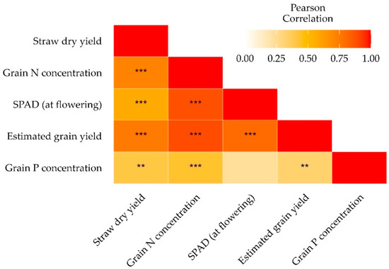 The SPAD data of the penultimate measurement (10 June 2021) during flowering, straw dry matter yield, and grain P and N concentration were considered the best indicators of differences between the treatments (Section 3.1). To test our assumption, we determined the relationship between these observations, grain P concentration, and (later) the estimated grain yield using a calculated pairwise Pearson correlation between the traits (Figure 5).