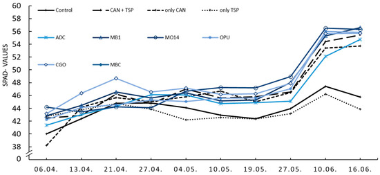 The SPAD measurements during the growth period of winter wheat in spring 2021 showed different patterns for the six N-BBFs (Figure 6) and for the six P-BBFs (Figure 7). The N-BBFs showed a higher scattering of the data for the period from 6 April 2021 (tillering) to 16 June 2021 (flowering) than the P-BBFs. In the last measurement, the SPAD values of the crops treated with N-BBFs were between those of the mineral N references (CAN, CAN + TSP), which had higher SPAD values, and the references without mineral N (Control 0, TSP) with lower values. The P-BBFs had similarly high SPAD values as the N references in the last measurement and showed an overall lower fluctuation of data between tillering and flowering than the N-BBFs.