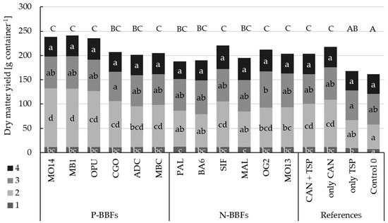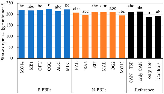 Mean values of straw yield (dry matter) in g per container for all treatments. Blue bars represent P-BBFs, orange bars N-BBFs, and black bars the mineral references or unfertilized (Control 0). Treatments with at least one identical letter are not significantly different from each other (Tukey’s HSD, α = 0.05). Pooled standard error 6.08.