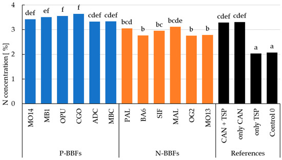 Mean grain N concentration (%) of winter wheat for all treatments. Blue bars represent P-BBFs, orange bars N-BBFs and black bars the unfertilized (Control 0) and mineral references. The mean values of fertilizers with at least one identical letter are not significantly different from each other (Tukey’s HSD, α = 0.05). Pooled standard error 0.16.