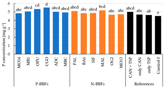 Mean values of grain P concentration of winter wheat for all treatments. Blue bars represent P-BBFs, orange bars N-BBFs, black bars the unfertilized (Control 0) and mineral references. The mean values of fertilizers with at least one identical letter are not significantly different from each other (Tukey’s HSD, α = 0.05). Pooled standard error 0.22.