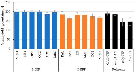 Estimated values of winter wheat grain yields for all treatments. Blue bars represent P-BBFs, orange bars N-BBFs, black bars the unfertilized (Control 0) and mineral references. The whiskers show the standard deviation of means for each treatment.
