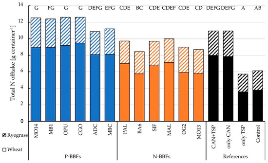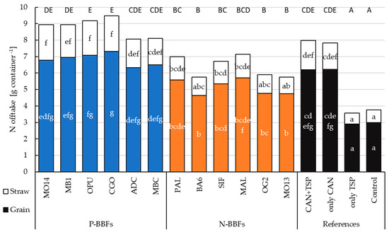 Mean values of N offtake of winter wheat components for all treatments. Blue bars represent P-BBFs, orange bars N-BBFs, black bars the unfertilized (Control 0) and mineral references. The treatments with at least one identical letter per straw-, grain-, and total N offtake are not significantly different from each other (Tukey’s HSD, α = 0.05). Pooled standard error 0.44 (grain), 0.19 (straw).