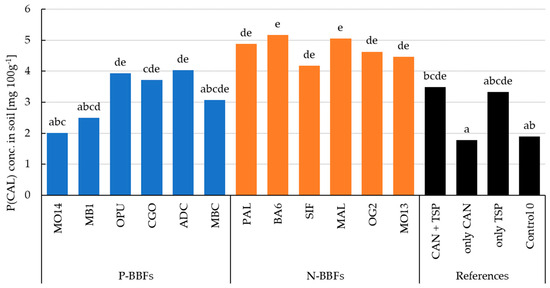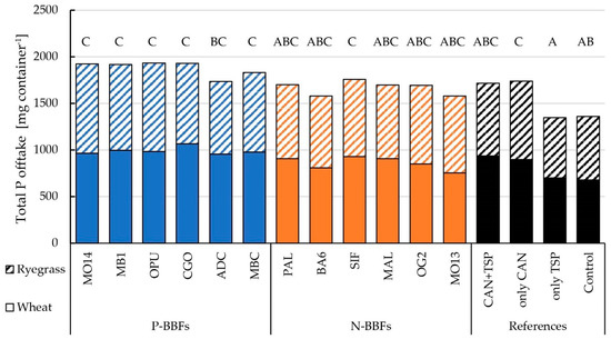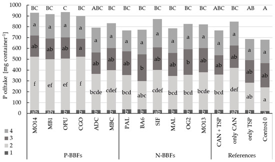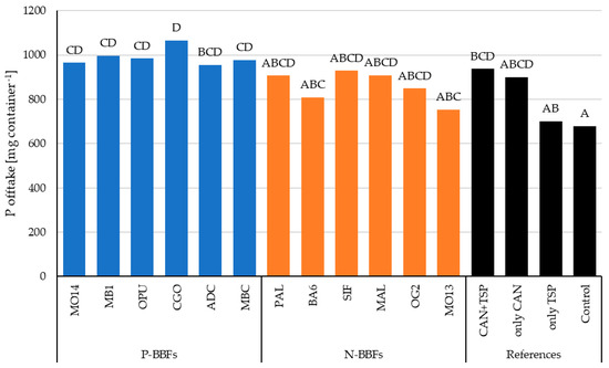 In winter wheat straw, P levels are negligibly low and, thus, P contents were not considered for P offtake [35,36]. The fertilization treatments differed highly significantly from each other in winter wheat P offtake (grain). The BBFs had a significantly higher P offtake compared to the unfertilized control and “only TSP”. Here, “only CAN” and “CAN + TSP” did not differ significantly from the BBFs. The P-BBF group showed significantly higher P offtake than the N-BBF group (Figure 13). The P-BBF “CGO” had the highest P offtake of all BBFs.
