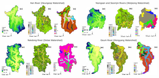 Digital elevation model (DEM), land use map, and soil map used as input data for the SWAT model. (a–c) represent the digital elevation model, land use map, and soil map, respectively, for each watershed.