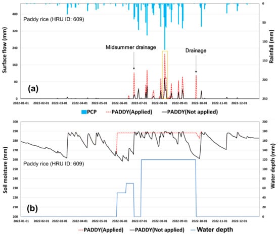 Simulation results for the paddy field with HRU = 609 before and after implementing the Paddy module: (a) simulated surface flow and rainfall and (b) simulated soil moisture and water depth of the paddy field. The water depth reflects conditions in the paddy field when submerged after implementing the Paddy module.