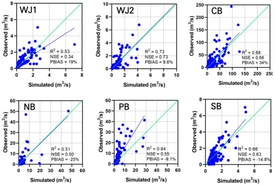 The lines of best fit, depicted as blue lines in each plot in Figure 4, indicated that the streamflow was distinctly underestimated at PR and SB, while it was overestimated at WJ. Although the best-fit lines in CB, WJ2, and NB aligned relatively well with the 1:1 line, WJ2 and CB still showed a slight tendency toward overestimation. Nonetheless, the overall runoff simulations for the four reservoir watersheds using the SMP model were found to be satisfactory based on the watershed model performance evaluation criteria [].
