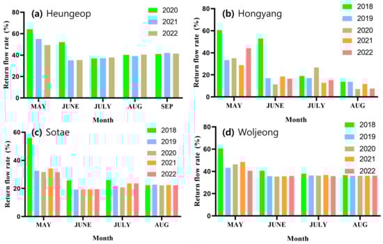 The monthly subsurface return flow rates for each reservoir are presented in Figure 5. For the Heungeop Reservoir (Figure 5a), the highest rate occurred in May, followed by a decrease in June and July, with a slight increase in August and September. For the Hongyang Reservoir (Figure 5b), the monthly subsurface return flow rates were 40.4% in May, 23.2% in June, 18.1% in July, and 10.8% in August, showing a consistent decline after May. The Sotae Reservoir (Figure 5c) showed average subsurface return flow rates of 37.2% in May, 20.6% in June, 23.1% in July, and 22.4% in August. The Woljeong Reservoir (Figure 5d) recorded 47.8% in May, 36.7% in June, 36.6% in July, and 36.2% in August.