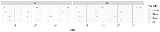 The augmented design-based trial for each subset at each location was composed of four blocks of 52 plots each. In each block, 44 accessions (non-replicated) and two of the four checks (according to their ploidy level), each replicated four times (44 + (2 × 4) = 52), were sown. Sowing was performed at a seeding rate of 800 seeds/m2 for diploids and 740 seeds/m2 for tetraploids, which is a standard rate for red clover in this area. The trials were established in the spring of 2020 at all locations. The field trials were managed with standard methods for sowing, harvesting, fertilizing, and pest management according to the protocols of the trial sites. The trial was fertilized in spring after each harvest. The fertilizer applied contained phosphorus and potassium but not nitrogen. Weed management was performed as standard with spray application using the appropriate active substance and timing for the specific weed, which was specific to each trial site. The first biomass harvests were conducted in mid-June in Svalöv, mid-to-late June in Rådde and Lännäs, and late June in Ås in 2021. These were according to the regular forage harvesting time and weather conditions for that year at each location determined by growth rate and weather conditions (Figure 1). The second biomass harvests were conducted in early August in Svalöv and Ås and in late July in Rådde and Lännäs in 2021. The third harvests were conducted in late September to early October in Svalöv, in early September in Rådde, and in late August in Lännäs in 2021. The fourth, fifth, and sixth harvests were performed in 2022 during the same period as the first, second, and third harvests, respectively. Harvests at Ås were only conducted twice per season because of the short growing season. The dry matter (DM) yield of each plot was estimated by collecting freshly cut samples, weighing them, drying them, and weighing them again. The first three harvests from all sites were analyzed for forage quality. Crude protein (CP) and NDF were analyzed using the NIR System 6500 (Foss, Hillerod, Denmark) with fg2019.eqa calibrations [28] (Association of German Agricultural Analytic and Research Institutes, VDLUFA, Germany). The reference method for NDF was according to Van Soest, Robertson, and Lewis [29] omitting amylase and sodium sulfite.