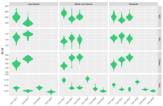 A violin plot of the estimated genetic values (BLUES) across the tested sites for (rows) net energy for lactation (NEL), neutral detergent fiber (NDF), protein content, and yield at each cut (columns) in the late diploids, middle-late diploids, and tetraploids. The mean is marked with a point on each violin.