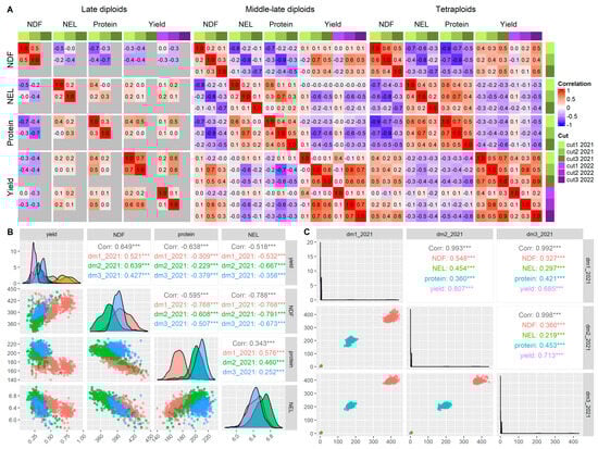 A heatmap (A) showing genetic correlations within traits (between cuts). The heatmap is split by subgroup and shows the Pearson correlation between dry matter yield (yield), protein, net energy for lactation (NEL), and neutral detergent fiber (NDF), arranged by cut (first, second, and third for 2021 and 2022). The Pearson correlations without consideration of subgroups between (B) traits and (C) cuts where each subgroup is separated by color. Each Pearson correlation is marked with asterisk signifying level of significance, where *** is p-value < 0.001.
