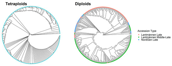 Neighbor-joining trees based on Nei’s standard genetic distance for tetraploids (left) and diploids (right). Each terminal branch is an accession, which is color-labeled based on whether it is from NordGen or Lantmännen and either late- or middle-late-maturing.