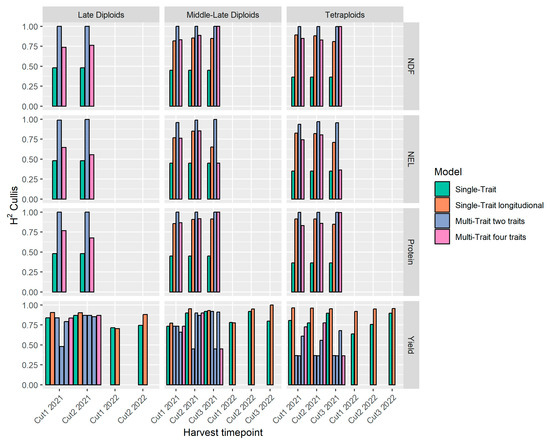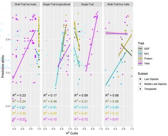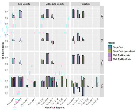 The coefficients of determination (R2) between H2 and the estimates of the models’ predictive abilities (Figure 8) indicate the extent to which the predictions were based on genetic variance. A low R2 between the two suggests that BLUP variability is not mainly due to genotypic variance. However, if an increase in H2 results in a higher predictive ability of a model, it shows that genotypic variance makes a major contribution to the variance in BLUPs. For forage quality traits, there seemed to be a decrease in PA as H2 increased. The MT1 model’s high H2 could be due to a strong genetic correlation between traits where the interaction effect of genotypes and traits was overestimated. In the case of the ST model for quality traits, H2 differed among the germplasm subsets, where the late diploids had the highest H2 followed by the middle-late diploids and then the tetraploids. The reverse was observed for PA. This could be due to non-additive effects not explained by the Gaussian kernel. The STL and MT2 models followed the hypothesis of increased H2 as a function of predictability. The STL models could capture the non-additive effects in the interactions between genotype and cut, thus improving predictive ability as H2 increased. The genetic correlations between forage quality traits (−0.4 to −0.8 between NEL and NDF, −0.5 to −0.9 between NDF and protein, and 0 to 0.7 between NEL and protein content) were stronger than between yield and forage quality traits (−0.4 to 0.7 between NDF and yield, −0.6 to 0.2 between NEL and yield, and −0.7 to 0.5 between protein and yield). Thus, the MT2 model performed better than the MT1 model because there was a stronger correlation between forage quality traits than between yield and forage quality traits. For yield, all multivariate models seemed to overestimate either PA or H2, suggesting there was no beneficial model for improving yield when combined with quality. Overall, the variance in each correlation was high. This suggests that independent model formulation is needed based on each data set.