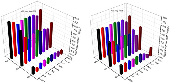 3.5. Effect of Different Exogenous Hormones on Total Starch Content in Rice Grains
