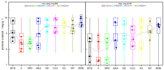 3.6. Effects of Different Exogenous Hormones on Protein Content in Rice Grains at the Maturity Stage