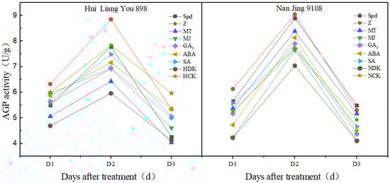 3.7. Effects of Different Exogenous Hormones on Adenosine Diphosphate Glucose Phosphorylated Enzyme (AGP) Activity in Rice Grains