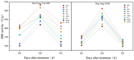 3.8. Effects of Different Exogenous Hormones on Starch Branching Enzyme (SBE) Activity in Rice Grains