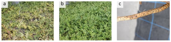 Symptoms of watermelon VD. (a) Watermelon plants with a symptom of chlorosis in the VD-affected plot. (b) Control plants without VD symptoms in the other plot. In (a,b), photographs were taken at 50 DAP after the fruit harvest. (c) Black spots on the surface of the roots from the VD-affected plot.