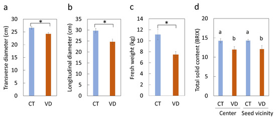 Effect of VD on transverse (a) and longitudinal (b) diameters, fresh weight (c), and soluble solid content (d) in watermelon fruits. CT and VD represent fruits from non-symptomatic control and VD-affected watermelon plants. To analyze total solid contents, watermelon flesh was measured at the center of the flesh and in the vicinity of the seeds. Data represent means and standard deviations from independent plant individuals (n = 9 for CT and n = 7 for VD). In (a–c), statistically significant differences at a 5% level determined by t-test are indicated by asterisks. In (d), statistically different values are indicated by different alphabets using one-way ANOVA with post hoc Tukey HSD test (p < 0.05).