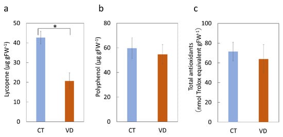 Lycopene assay was performed as described previously [] with the following modification. The 100 mg of the homogenate was mixed with 8 mL of HAE-BHT solution (hexane–acetone–ethanol, (2:1:1 (v/v)), supplemented with 0.05% butylated hydroxytoluene) in a 15 mL plastic tube. Three 5 mm and one 10 mm stainless steel bead were added. Then, the tube was placed horizontally in a shaking incubator (MildMixer PR-36, Taitec, Koshigaya, Saitama, Japan) and shaken at medium speed for 10 min at 25 °C. Then, 1.2 mL of water was added and shaken in the shaking incubator for 10 min. The homogenate was centrifuged at 8000× g for 10 min at 25 °C, and the optical absorbance of the supernatant was measured at 503 nm wavelength in a spectrophotometer (UH5300, Hitachi High-Tech, Tokyo, Japan). Lycopene content was calculated using the molecular absorption coefficient of lycopene (172,000 M cm−1) []. Six independent plant individuals each were used for both CT and VD fruits.