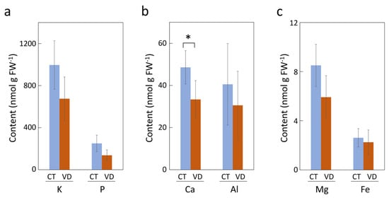 Contents of major minerals in the center of watermelon fruit flesh harvested from control watermelon plants (CT) and VD-affected (VD) watermelon plants. Data represent means and standard deviations obtained from independent plant individuals (n = 5 for CT and n = 4 for VD) for potassium (K), phosphorus (P) (a), calcium (Ca), aluminum (Al) (b), magnesium (Mg), and iron (Fe) (c). Statistically significant differences at the 5% level determined by t-test are indicated by asterisks.