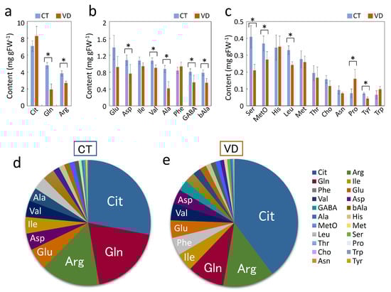 Amino acid content and composition in the center of watermelon flesh. The amino acids in the range over 2 mg gFW−1 (a), 0.5–2 mg gFW−1 range (b), and below 0.5 mg gFW−1 (c) are shown. Data represent means and standard deviations for five independent plant individuals for control (CT) and VD-affected (VD) fruits. In (a–c), statistically significant differences between CT and VD at the 5% level determined by t-test are indicated by asterisks. Pie chart representation for the amino acid composition for the control (d) and VD-affected fruits (e). Data are the average for five independent plant individuals for each chart.