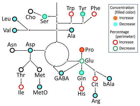 A schematic view of the metabolic pathway highlights the change in free amino acid accumulation levels in the VD-affected fruits. Amino acids, which significantly increased and decreased concentration at the fresh weight basis in the VD-affected watermelon fruits (p < 0.05 by t-test), are shown in orange and sky blue circles, respectively. Amino acids within which the percent fraction increased and decreased (p < 0.05 by t-test) in the VD watermelon are shown in the red and green perimeter of the circles, respectively. Amino acids with a black perimeter of the circles indicate that their difference in the percent fraction between VD and control watermelon was not statistically significant at the 5% level.