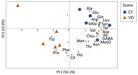 Principal component analysis of free amino acid accumulation patterns in the VD-affected and control watermelon fruits. Scores for the VD-affected (VD: orange triangles) and control (CT: blue circles) fruits from individual watermelon plants (n = 5) are plotted in the PC1-PC2 space. Small black dots show directions and relative strengths of the loading values for the respective amino acids.