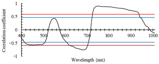 The correlation between the rice protein content and the spectral reflectance of the rice canopy. Here, the black curve represents the correlation at different wavelengths, while the red and blue line indicates the significance level at 0.01 and 0.05, respectively.