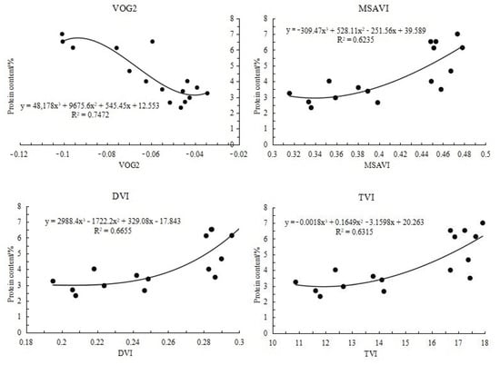 Cubic function models for estimating grain protein content based on VOG2, MSAVI, DVI, and TVI.