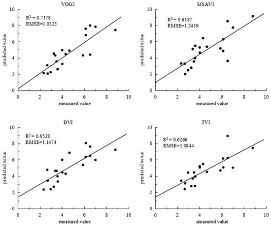 In order to validate the model further, partial data from experiment 2 were used as a validation set, with the results being shown in Figure 4. The estimation models constructed using the four vegetation indices demonstrated considerable consistency between predicted and actual values. The VOG2 model achieved an R2 of 0.7178 and an RMSE of 1.0325; the MSAVI model had an R2 of 0.6187 and an RMSE of 1.2459; the DVI model recorded an R2 of 0.6528 and an RMSE of 1.1474; the TVI model showed an R2 of 0.6266 and an RMSE of 1.0844. Among these, the cubic function model based on VOG2 performed the best in estimating grain protein content, exhibiting good fit and high precision. This indicates that using hyperspectral vegetation indices to construct multivariate regression equations for estimating rice protein content is feasible.