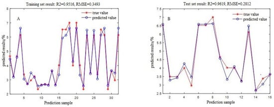 Model for estimating grain protein content using BP neural network ((A): training set result, (B): Test set result).