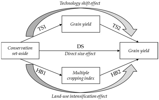 Equation (1) indicates that the conservation set-asides impact grain supply through multiple pathways. Land reduction induced by conservation set-aside is expected to negatively influence grain supply, which is labeled as a direct size effect. Grain supply changes due to a technology-induced grain yield change are defined as an indirect technology shift effect, and it is hypothesized that a technology shift positively mediates the relationship between the conservation set-aside and grain supply. The effect of conservation set-asides on grain supply mediated by cropping system changes is especially reflected in , which is defined as an indirect land-use intensification effect. The conceptual framework is summarized in Figure 2. We therefore adopt the following systematical empirical model to reflect the relationships between the conservation set-aside, grain yield, multiple cropping index, and grain supply: