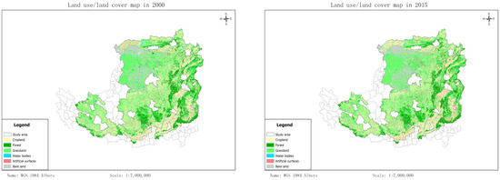 where is the area of cropland converted to forest and grassland during the period to , and is the area of cropland in year . Land-use/land cover maps are obtained from the Data Center for Resources and Environment Sciences of the Chinese Academy of Sciences, with a resolution of 30 m times 30 m (http://www.resdc.cn, accessed on 18 October 2024). The accuracy of the land-use classification is 94.3% with field verification and error correction [27,28]. The administrative boundaries of the counties are obtained from the national 1:1,000,000 database of the China Geographic Information Monitoring Platform (http://www.dsac.cn, accessed on 18 October 2024). The land-use classification and administrative boundary maps are matched to derive the land-use/land cover maps of our research area (see Figure 3 for the years 2000 and 2015, respectively). The county-level land area and meteorological data are then compiled with the spatial coordinate WGS_1984_UTM_zone_49N.