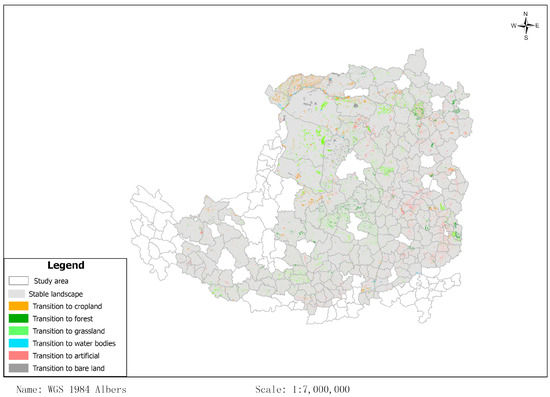 Remotely sensed land data are preferred to official statistics for several reasons. First, the incentives created by the program, combined with insufficient oversight, can lead to local governments overstating the area of cropland retirement. Second, the region covered by the GGP overlaps with other ecological restoration programs, such as the “Three North” Shelterbelt Development Program. Thus, the official statistics of the GGP may not properly represent the amount of cropland converted to vegetation. Finally, the tremendous changes in land-use and land cover have attracted many scholars to study the patterns and driving forces among different regions. Remote sensing images have been widely used in international studies [29,30,31]. The satellite image-interpreted land transition of the Loess Plateau is presented in Table 1 and Figure 4. During the period from 2000 to 2015, 0.35 and 0.89 million hectares of cropland were converted to forest and grassland, respectively, accounting for 58.59% of the total cropland transitioned. In sum, the satellite recorded 1.24 million hectares of cropland being retired to vegetation in the Loess Plateau, which is about 37.71% of that of the official statistic (3.28 million hectares during the period from 2000 to 2015). We also find that the cultivation of parts of the forest and grassland is resumed during this period. This is especially evident from the 0.71 million hectares of grassland being transitioned into cropland during the period from 2000 to 2015. Compared to a projected decrease in cropland and an increase in forest over the period from 2000 to 2015, the transition matrix implies a comparatively smaller (in magnitude) decrease in grassland over the same time horizon.